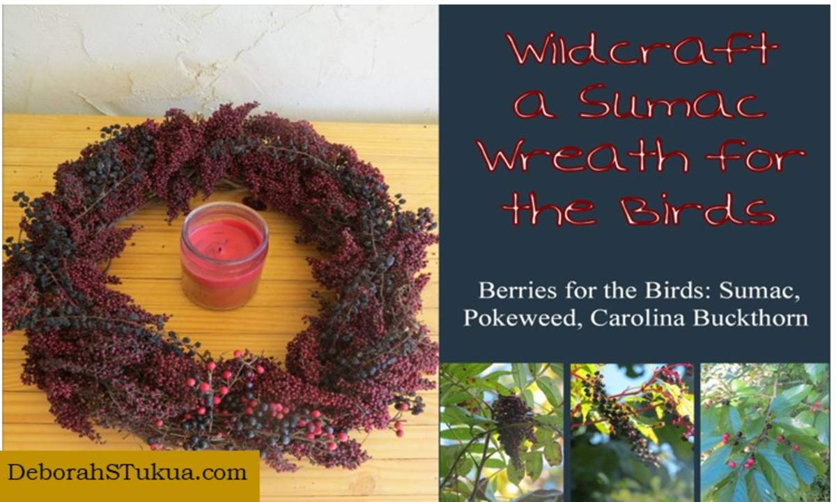 The natural berries available in the wild, vary depending on your location. On our property, I gathered sumac, pokeweed berries, and Carolina buckthorn along the edge of the woods, to make the wreath shown in the photograph.