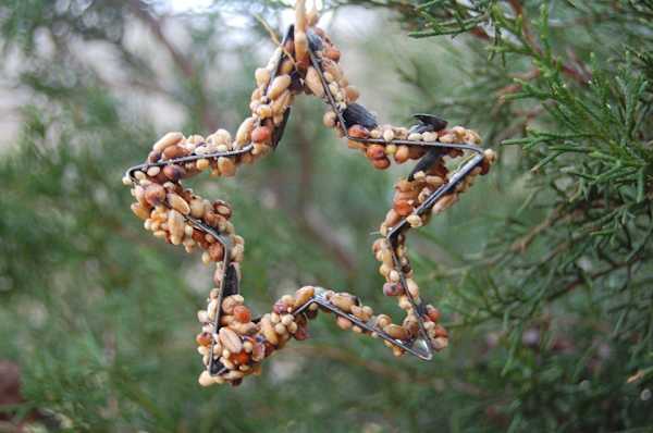 · Cut cardboard into small triangles, circles, or other festive shapes using stencils. Punch a hole near the top and insert a loop of string for hanging. Coat both sides of the cardboard shape with peanut butter or molasses. Sprinkle any of the following: bird seed, pumpkin seeds, sunflower seeds, and dried corn kernels onto the sticky base.