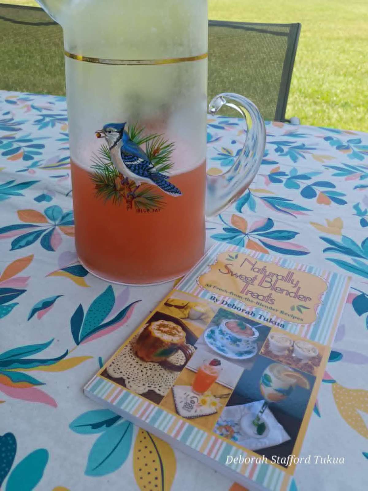 In keeping with the style of the book photographs, I selected my favorite vintage glass pitcher. It has a cardinal bird on one side and a bluejay on the other. It reminds me of the gorgeous array of birds we are blessed to see as they dine frequently on the sunflower seeds in the bird feeder in our yard.