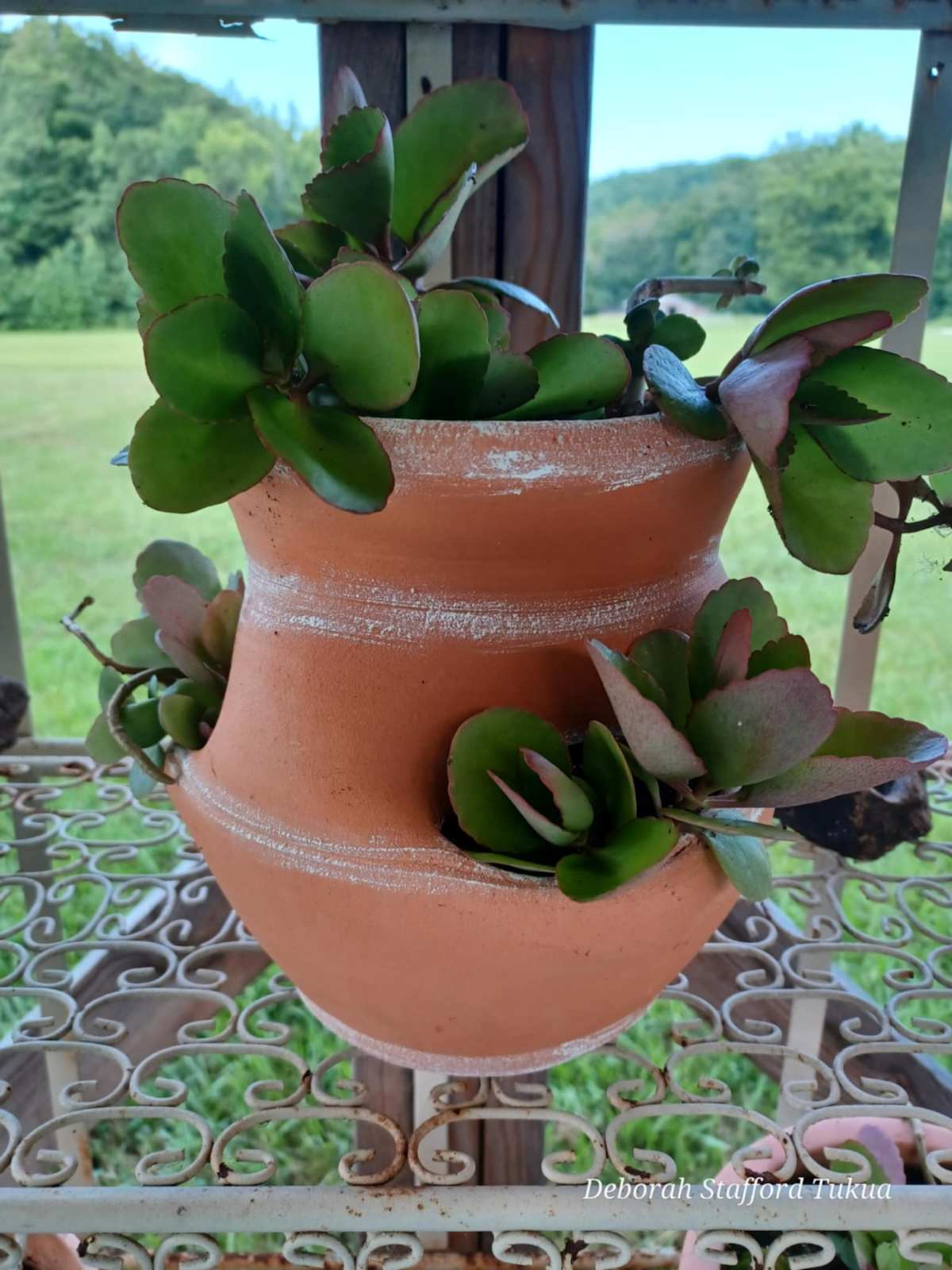 My favorite and shining star of the trio, a strawberry pot, handmade from red clay. The lovely jade peeks out from the side pockets, beautifully from every angle. Being a southern girl, I was excited to find this handmade Georgia red clay jar made in, you guessed it, the state of Georgia. How cool is that!! A son and daughter-in-love gifted the strawberry jar planter to me for my birthday. Now, my mother’s old jade plant is cared for, displayed and treasured in a special pot on my bakers rack on the covered patio.