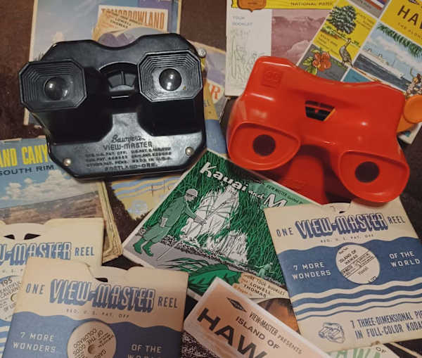 (The photograph above is a sample of my vintage View Master collection, including a black bakelite viewer, given to our family by an elderly neighbor, many years ago.)