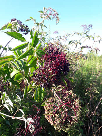 Elderberry plants grow wild in ditches, along stream banks and rural roadways along the Parkway and surrounding area. The berries are a rich source of antioxidants, vitamin C, and support immune health. They are often made into medicinal tinctures and syrups and taken as natural remedies for colds and flu symptoms. Birds love eating them too. Harvest elderberries once they darken, as shown in the top cluster in the photograph. Do not ingest the leaves or stems.