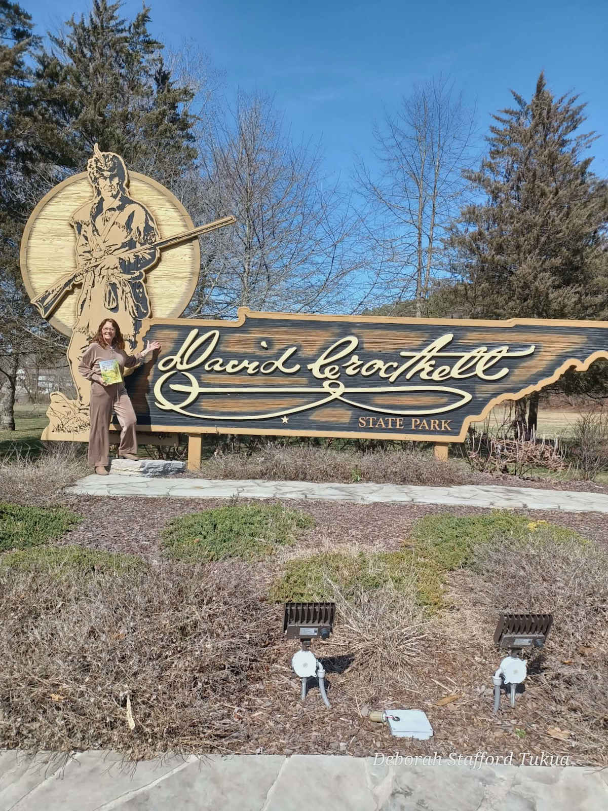 David Crockett State Park in Lawrenceburg, TN is one of my favorite parks. I’m doing a frontier, happy dance at the park entrance, thrilled to announce that my Natchez Trace book is now available in their shops.